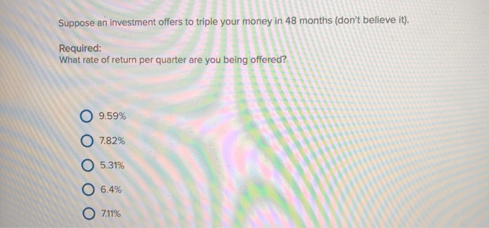 What rate of return per quarter are you being offered. An investment offers to triple your money in 24 months dont believe it. N 18 months or 183 6 quarters Since we need a three.